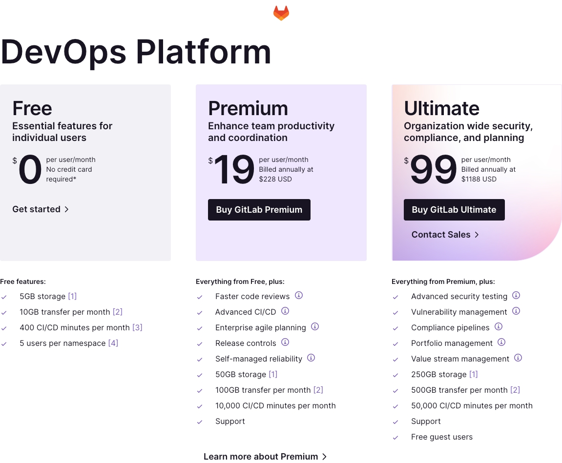 所以,如果需要用到 gitlab 的全部高级功能,那么得去升级到高级版 (premium) 才行,价格如下图所示,
